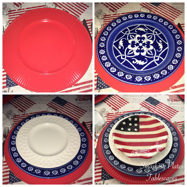 | The plate stack. The red charger plates are from AC Moore. The Catalina Medallion dinner plates are available at Replacements Ltd. The white salad plates are a thrift store find. The flag plates were found at AC Moore many years ago. |