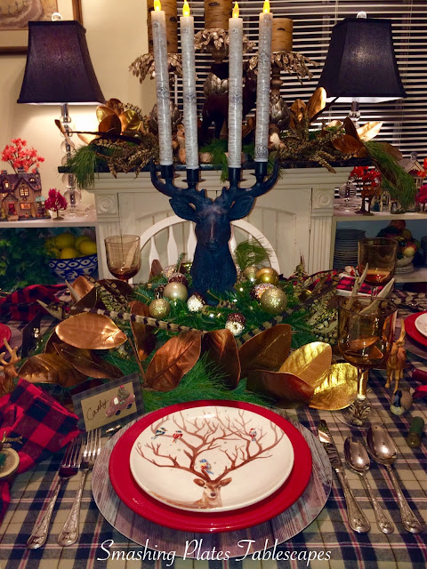 The focal point of The Stag Party tablescape is a beautiful deer candelabra from the Lisa Robertson home collection. I found the pretty stag plates last year at Pier One. The minute Lisa showed the deer candelabra I knew it would be perfect with the stag plates. I dream of living in Jackson Hole, Wyoming one day and I enjoy creating a rustic table that reminds me of my visit to Jackson years ago. Last year I used pretty moose plates for my Jackson Hole Christmas table. I may not be leaving So. FL anytime soon for Jackson Hole, but I will enjoy having dinner at this table and dreaming of what the future may hold.